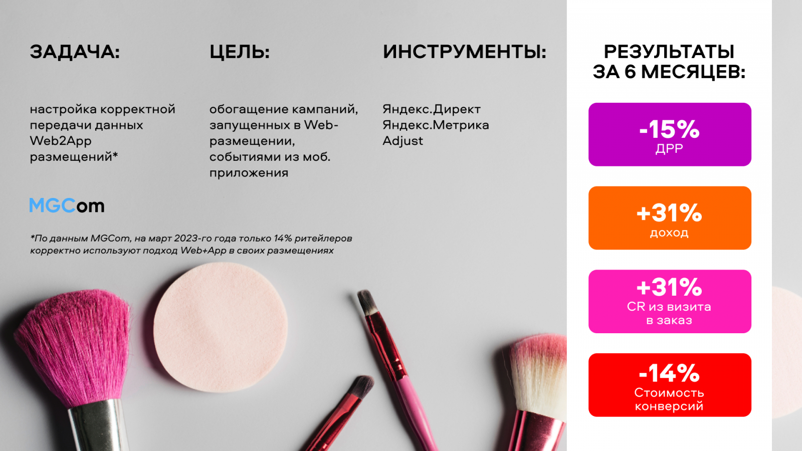 По данным MGCom, на март 2023-го года только 14% ритейлеров корректно используют подход Web+Аpp в своих размещениях.