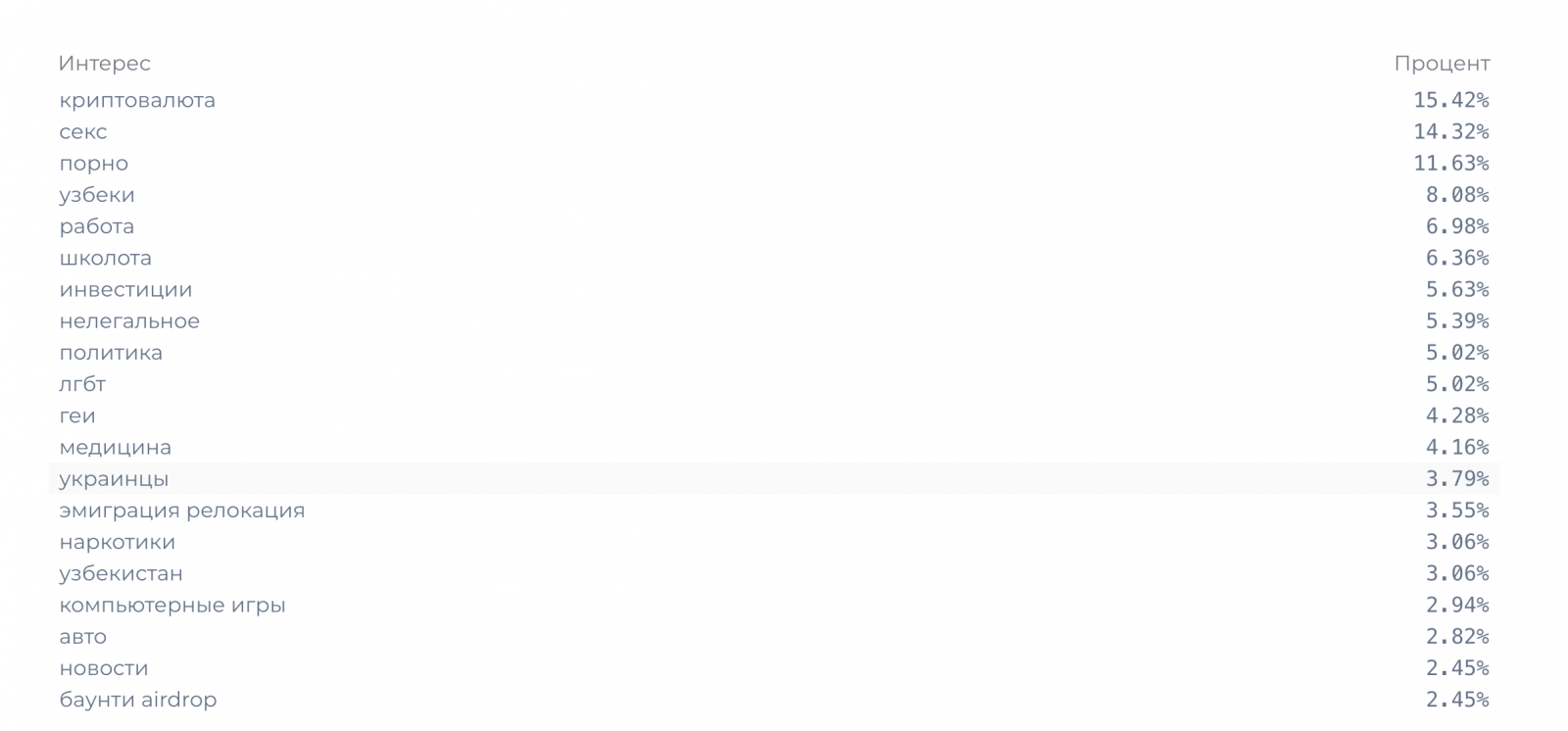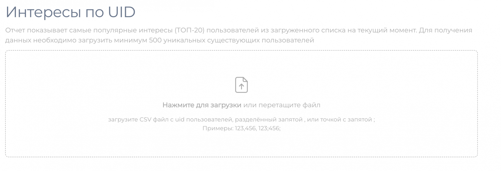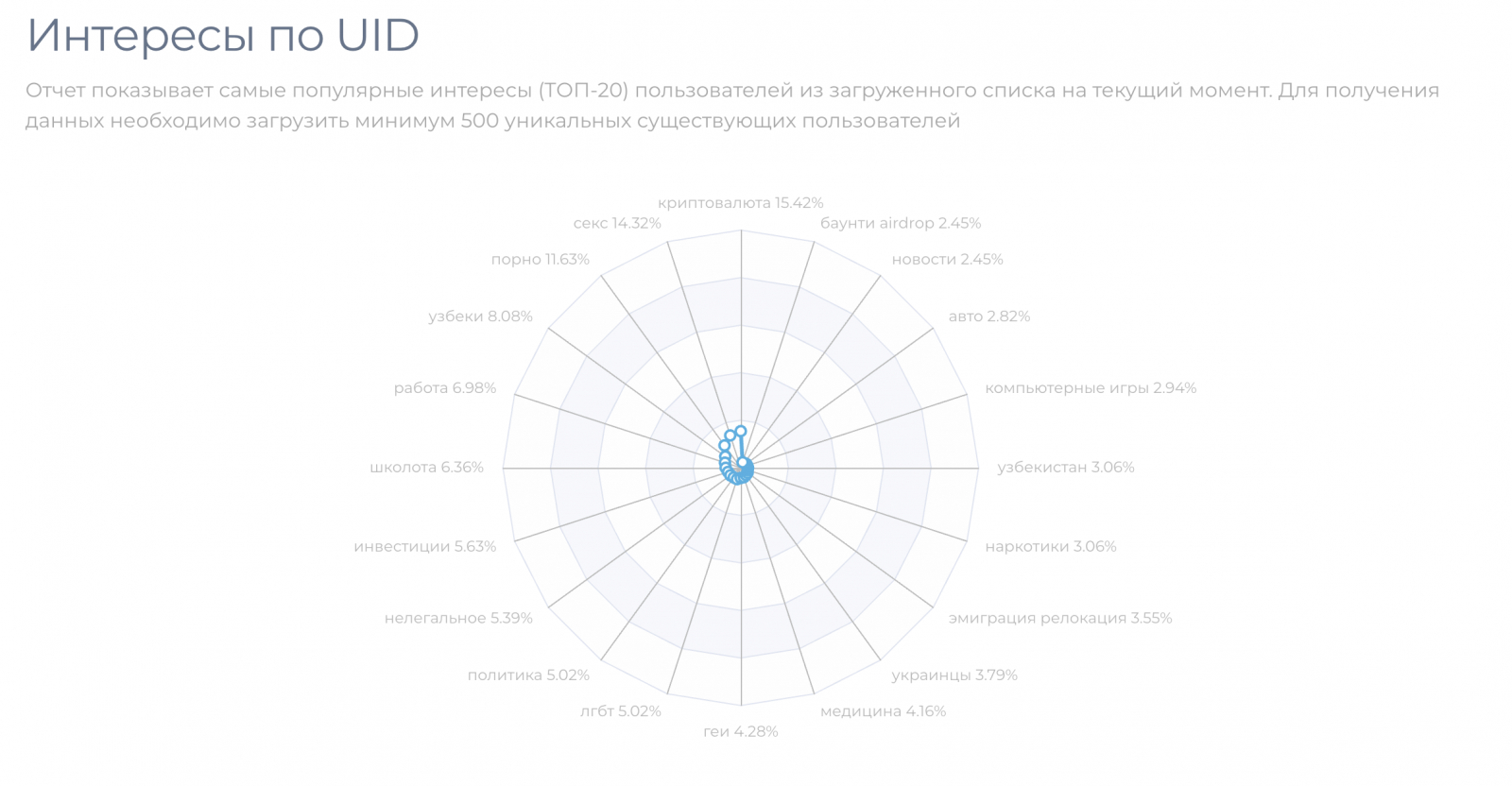 Наш новый отчет показывает самые популярные интересы (ТОП-20) пользователей на основе загруженного списка их ИД.