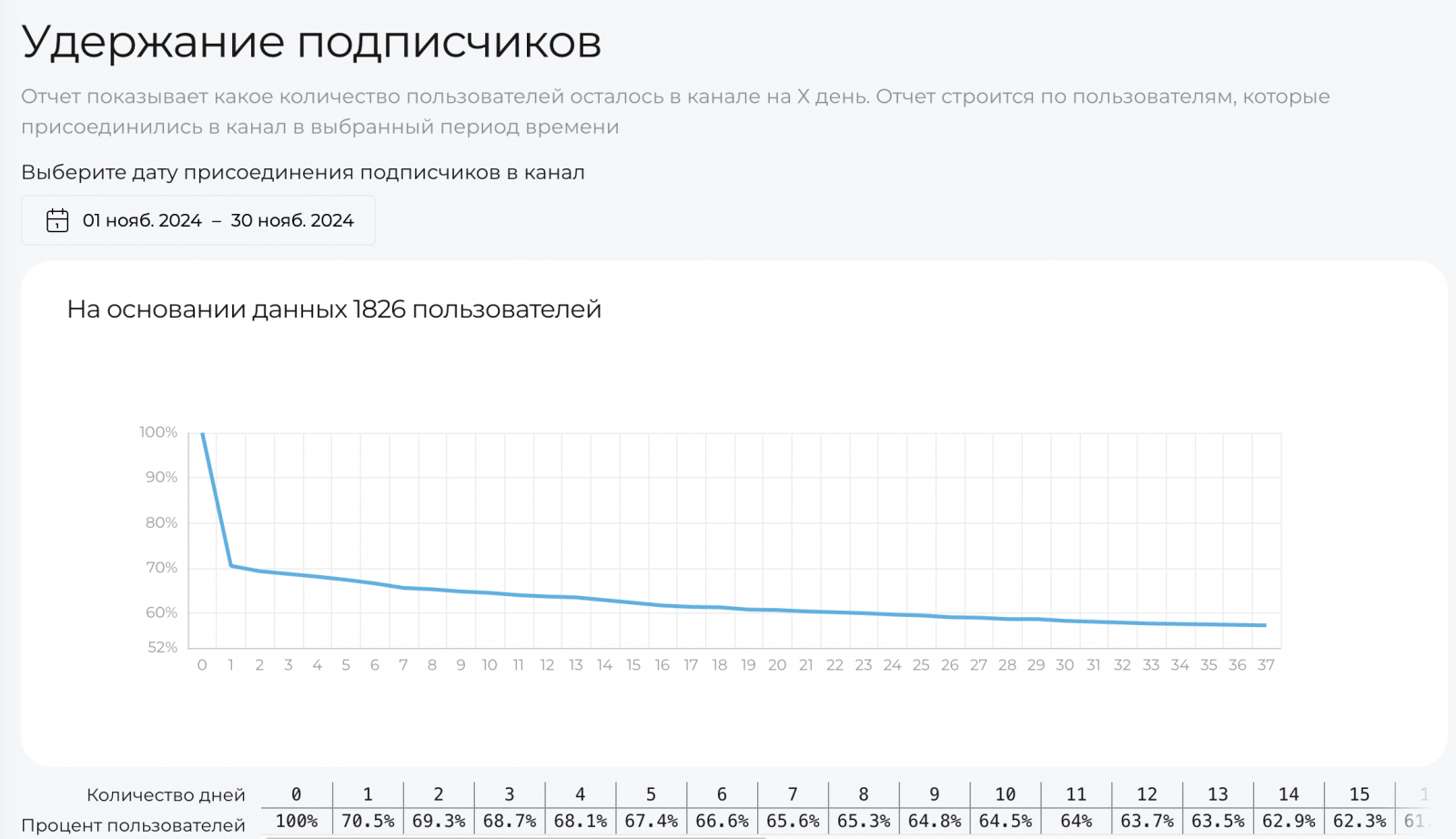 - Например, если в канал вступили 100 человек, и через 30 дней осталось 60, Retention Rate = 60%