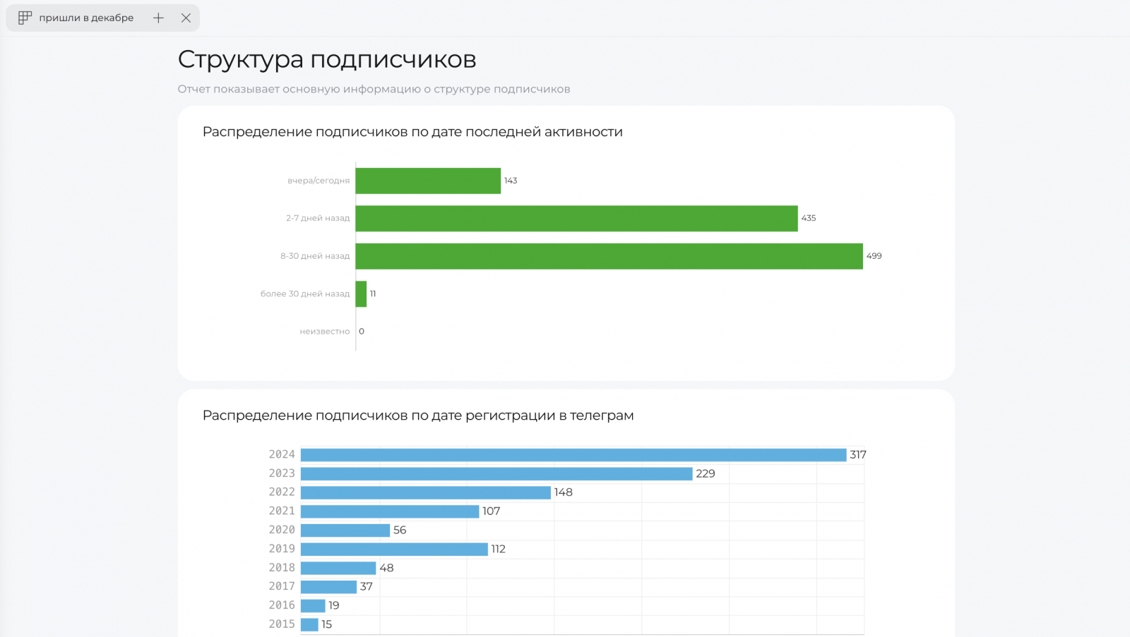 Структура подписчиков - детализация подписчиков по дате последней активности в телеграм и по дате регистрации.
