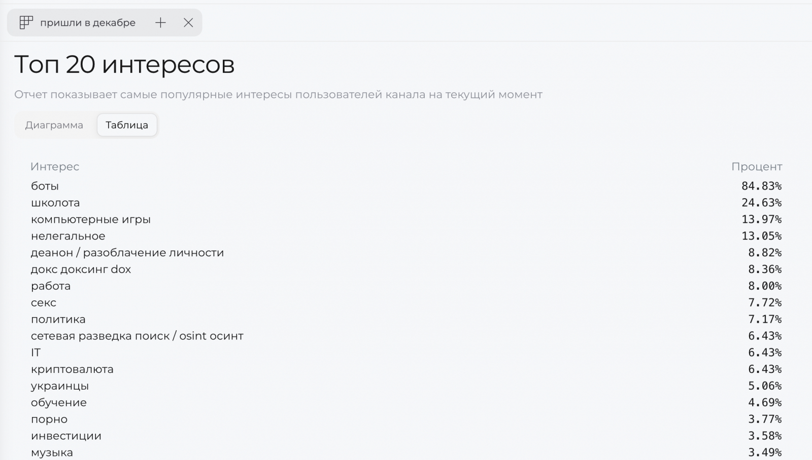 Понимание интересов подписчиков, которые пришли из определенного источника помогает определиться с источниками привлечения трафика целевой аудитории или фейков/накруток.