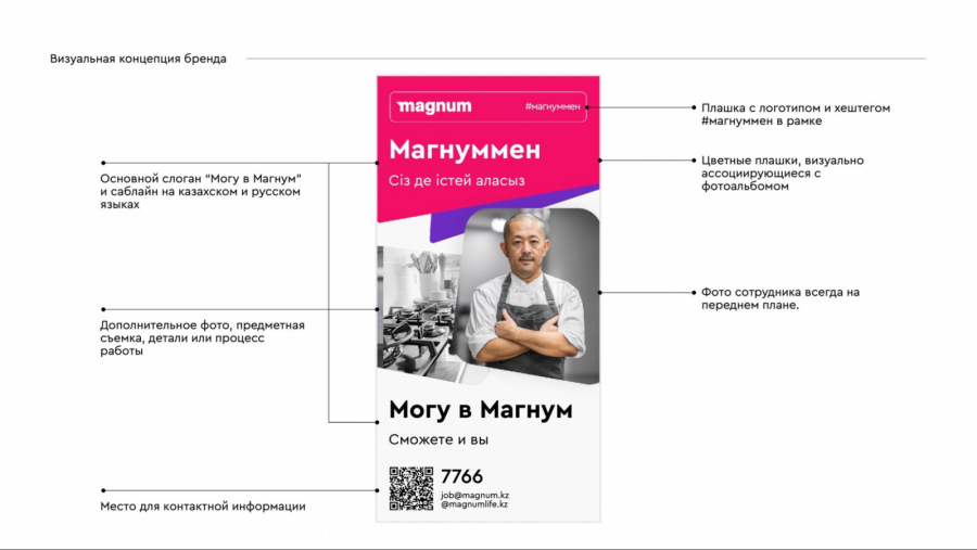 Идея гордости обозначилась и в слогане: новое позиционирование ритейлера — «Могу в Магнум». Это не только игра на созвучии слов, но и возможность каждого сотрудника выразить своё отношение к работе в торговой сети. Для усиления смыслов агентство также предложило использовать дополнительные саблайны, которые могли бы продолжить главное сообщение. Например: