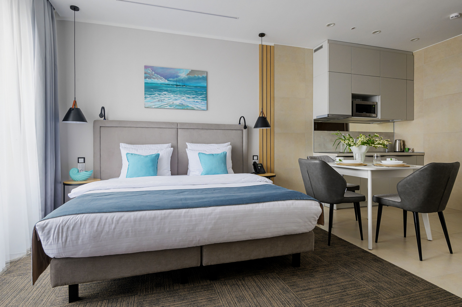 Наш номерной фонд состоит из 76 номеров различных категорий, каждый из которых оснащен мини-кухней с необходимым оборудованием, посудой, кондиционером, Wi-Fi, сейфом, феном и hotel TV.