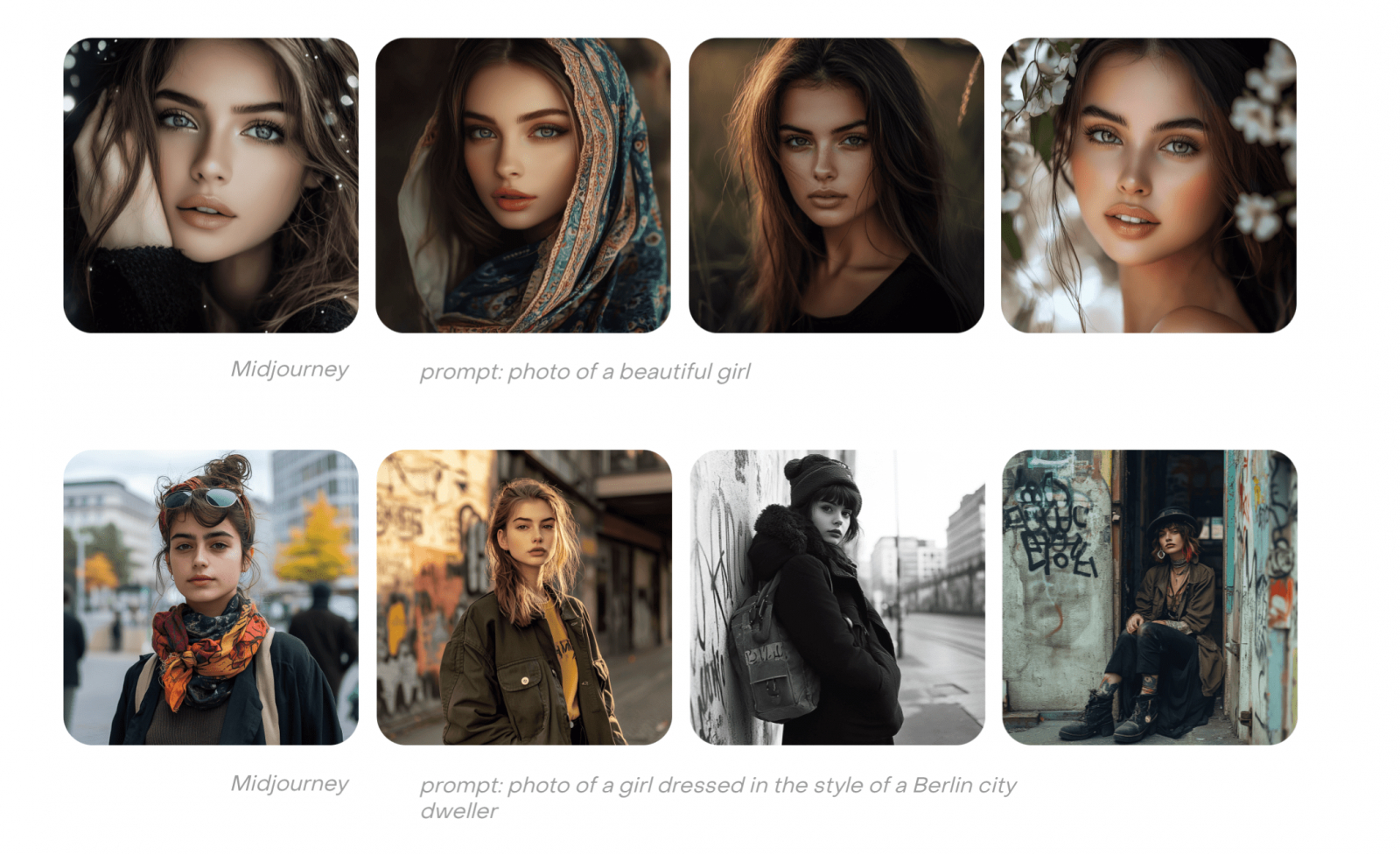 - Точные промты. В запросе не стоит использовать оценочные прилагательные — «прекрасный», «очень красивый» и т.д., иначе получится типичная «нейросетевая» картинка, где все люди выглядят стереотипно красиво. Лучше написать «обычный парень» или «девушка, одетая в стиле городского жителя Берлина» — результат будет точнее.