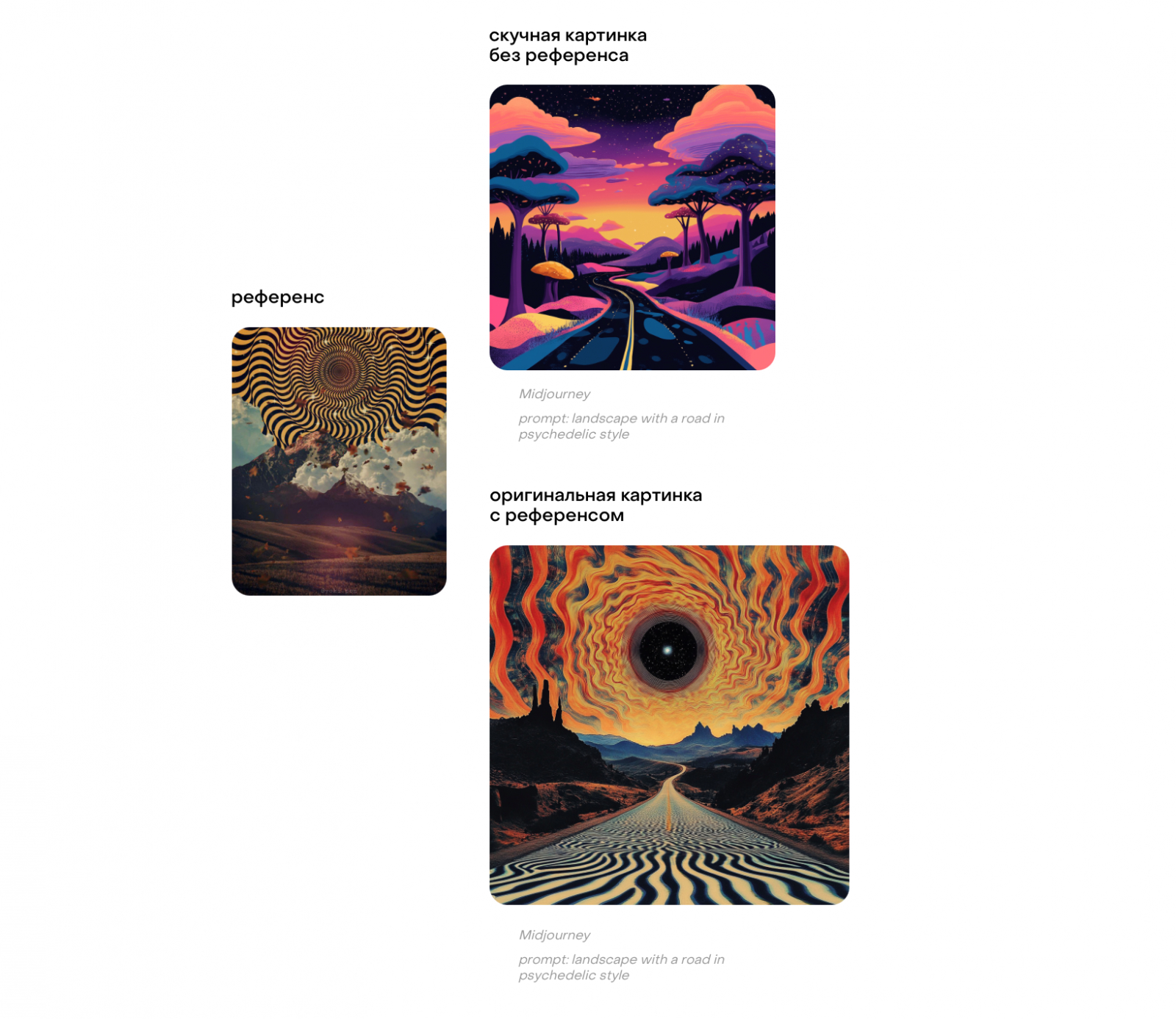 - Стиль генерации. Что хочется получить: рисунок, фотографию, CGI-визуализацию? Всё нужно тщательно прописать. А ещё лучше использовать референсы: поищите пример картинки на пинтересте или других ресурсах и добавьте её к промту — такой результат будет намного лучше.