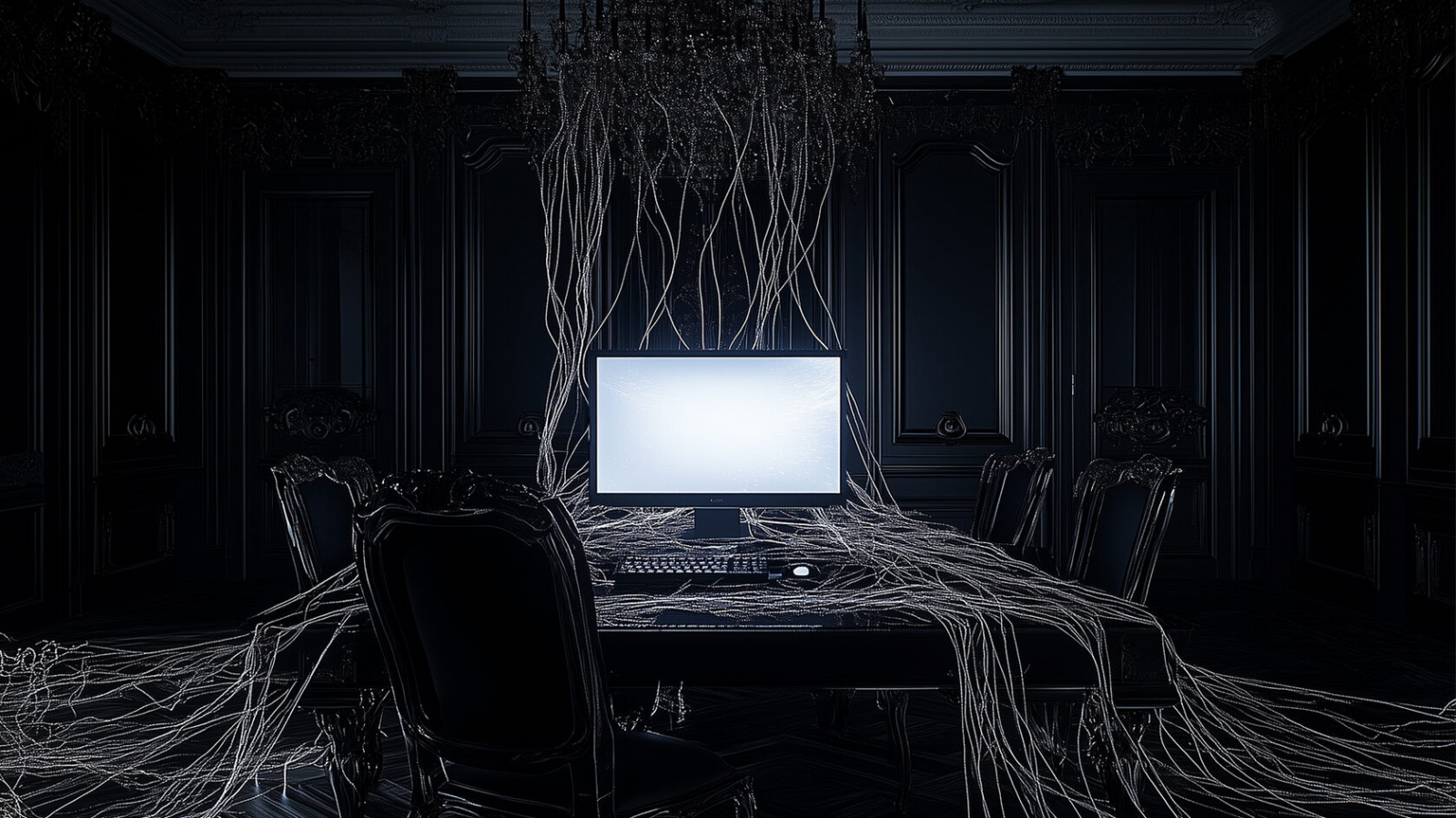 prompt:black room with classic interior, dining room, all furniture is black, there is a computer in the middle of the table, which glows with white light, many wires come out from it in all directions