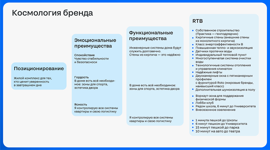 Позиционирование формируется до старта продаж: целевая аудитория, эмоциональные и функциональные преимущества и их подтверждения в продукте. Это база для всей дальнейшей коммуникации — наружки, радио, digital.