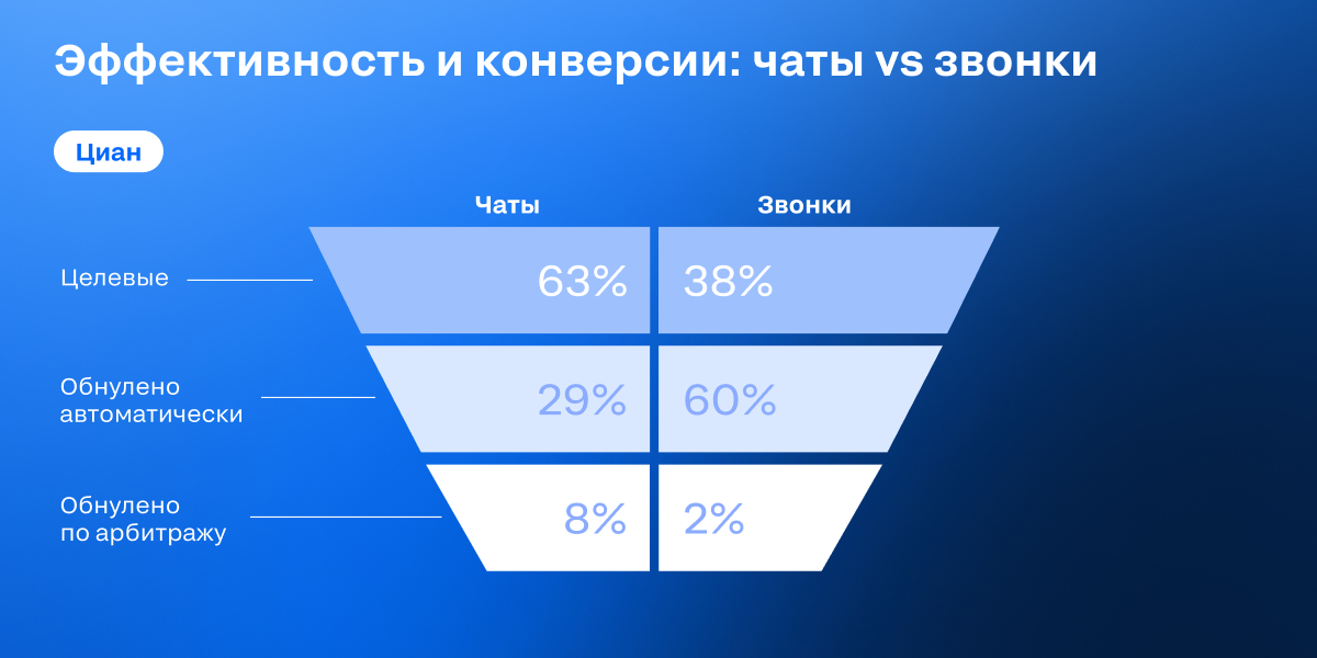 При этом 63% чатов на Циан признаются целевыми против 38% у звонков по данным Циан. Человек, который написал сам, в среднем более заинтересован.