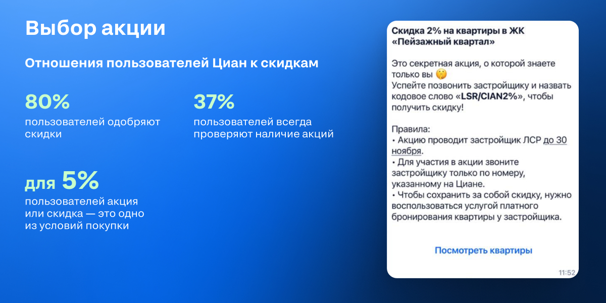 В качестве стимула выбрали скидку. Логика простая: аудитория уже теплая, она знает продукт и близка к решению. Данные Циан это подтвердили — 80% пользователей платформы позитивно относятся к скидкам, 37% всегда проверяют наличие акций.