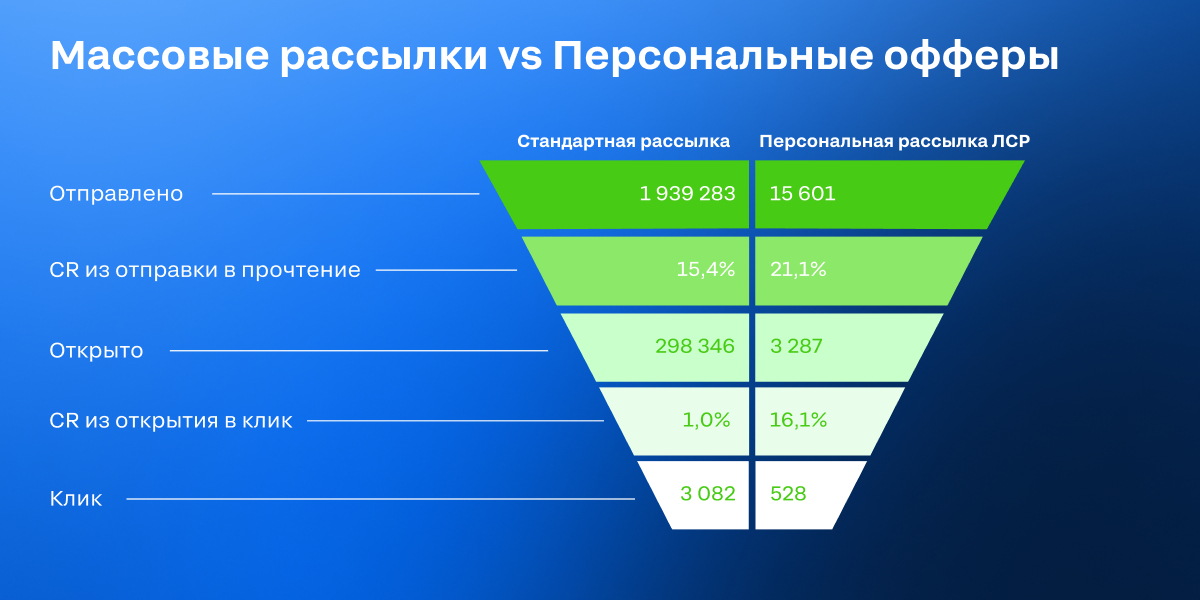 Персональная рассылка ЛСР показала конверсию из открытия в клик 16,1% — против 1,0% у стандартной массовой рассылки.