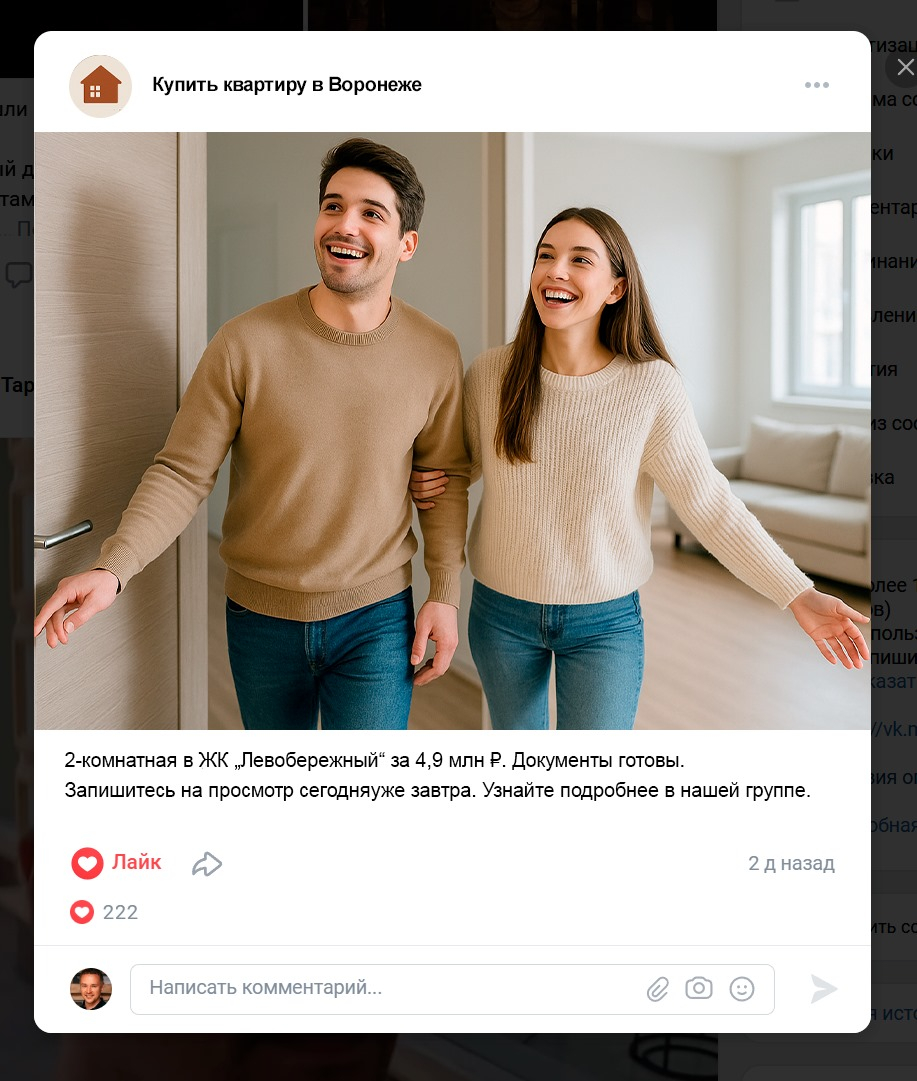 Лучший пост: фото квартиры + подпись «2-комнатная в ЖК „Левобережный“ за 4,9 млн ₽. Документы готовы. Запишитесь на просмотр сегодня» → 14 заявок за неделю.