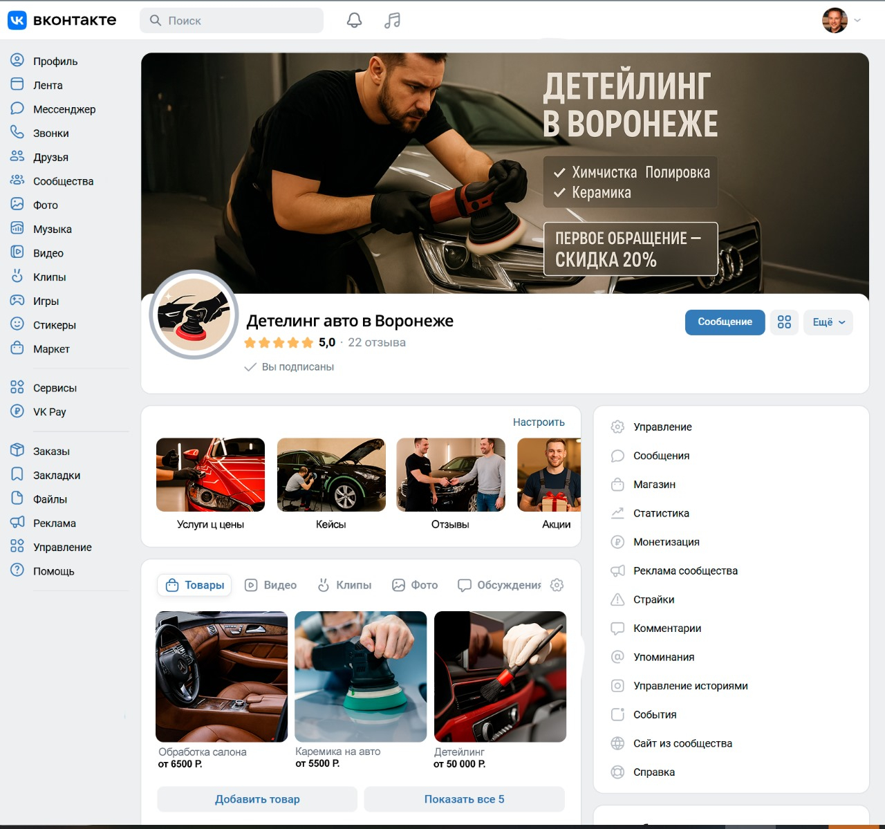 Сообщество детейлинг-студии должно выглядеть как онлайн-витрина услуг.