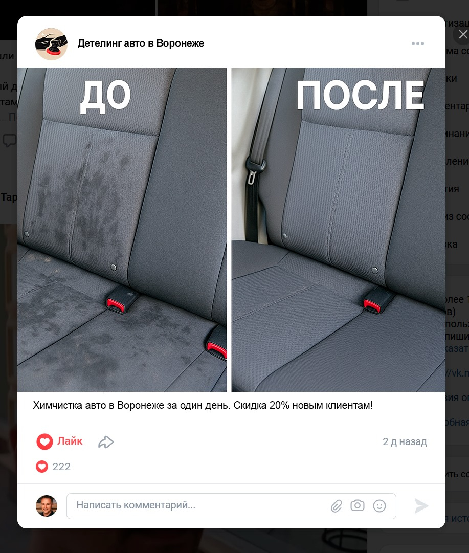 Лучший пост: фото салона «до/после» + подпись «Химчистка авто в Воронеже за один день. Скидка 20% новым клиентам» → 42 заявки за 10 дней.