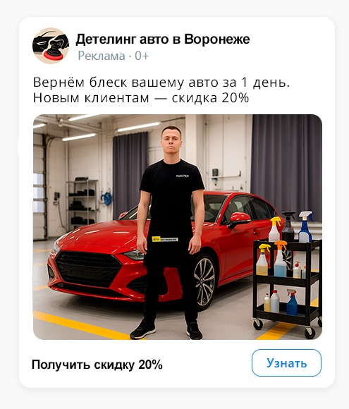 · Креатив: фото автомобиля «до/после» + текст «Детейлинг в Воронеже. Скидка 20% новым клиентам».