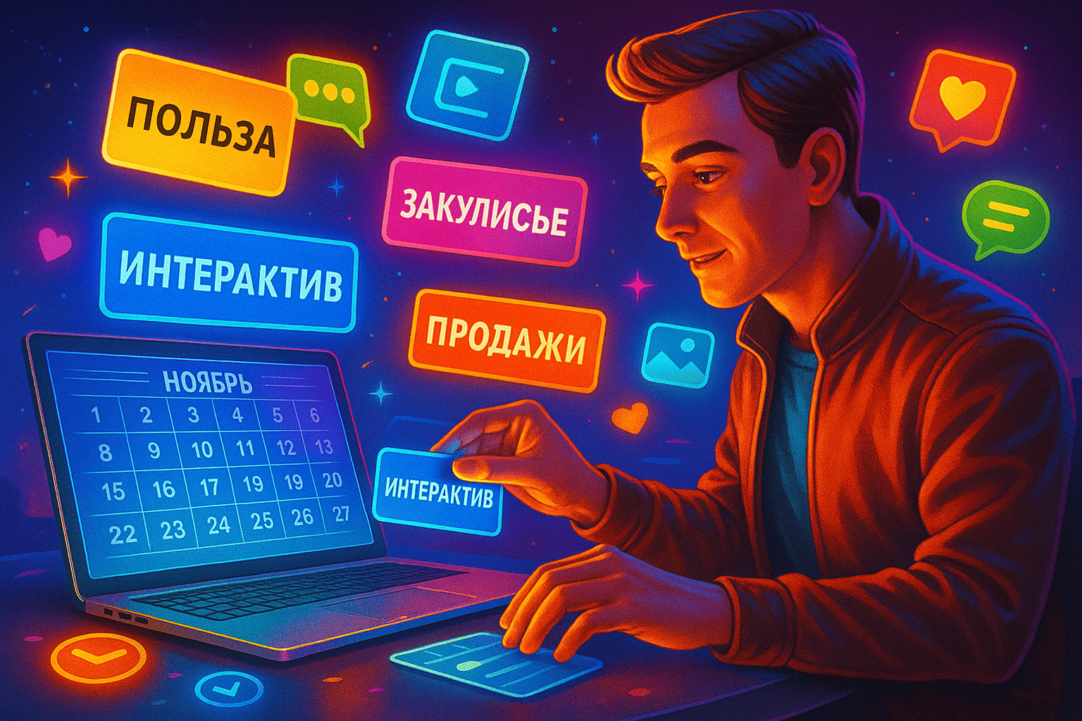 Мы сделали 4 блока: польза (советы, рецепты), закулисье (бариста, гости), интерактив (опросы, викторины) и продажи (комбо-наборы, акции). Разложили это по календарю — и лента стала интересной, без хаоса.
