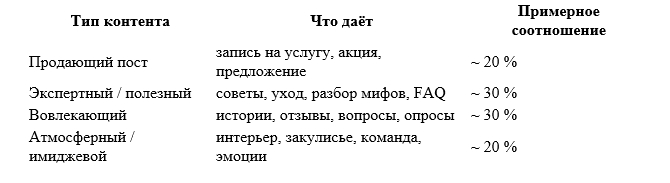 Чтобы страница во ВКонтакте работала, важно чередовать посты разных форматов: Продающий — запись на услугу, акция (~20%) Экспертный — советы, уход, FAQ (~30%) Вовлекающий — истории, отзывы, опросы (~30%) Атмосферный — интерьер, эмоции, закулисье (~20%)