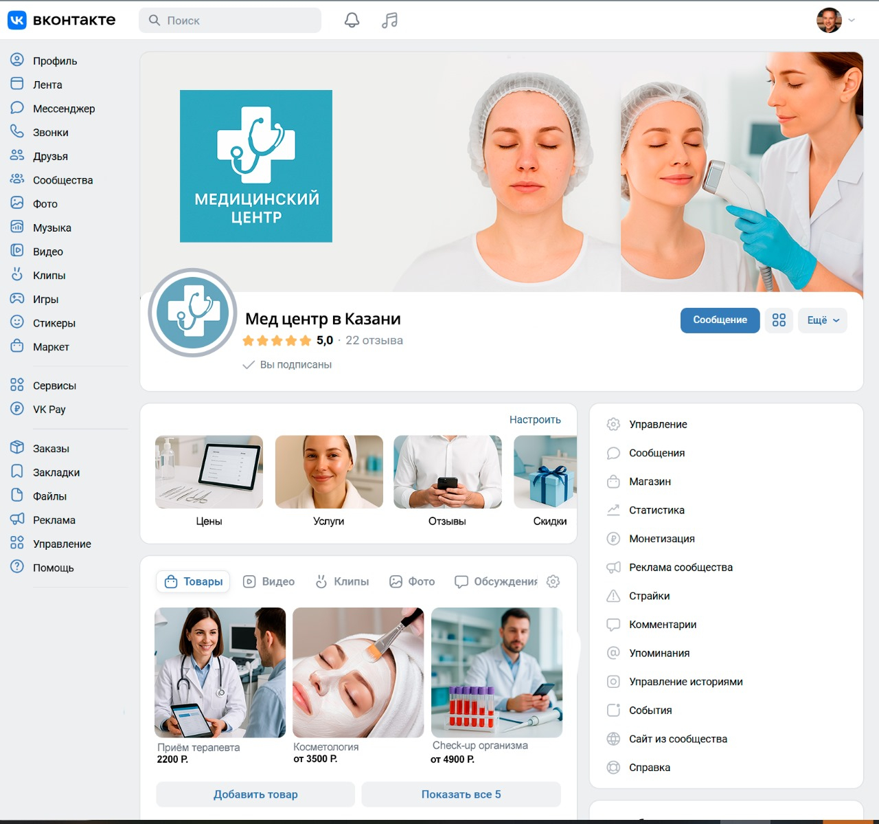 • Раздел «Товары в сообществе ВК» — оформили направления: терапия, косметология, УЗИ, анализы.