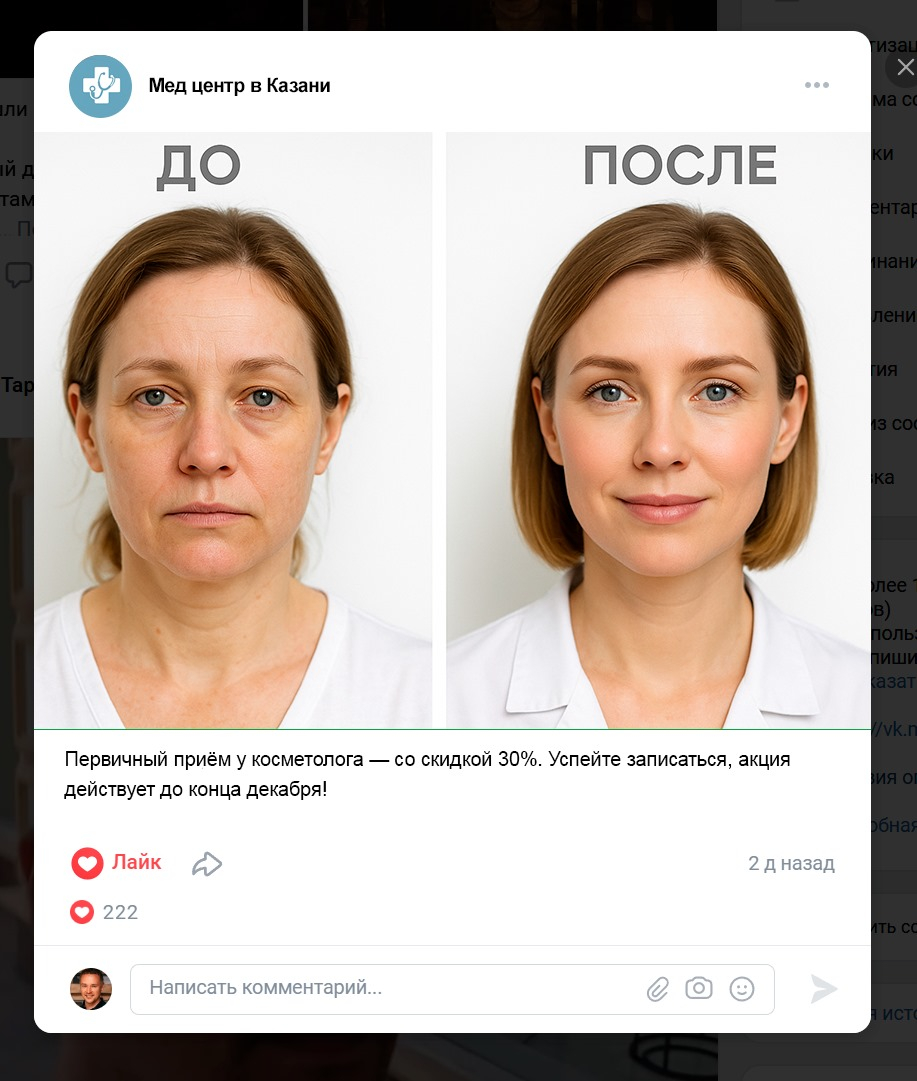 Ко мне обратилась медицинская клиника из Казани, оказывающая услуги терапевта, косметолога и диагноста. Клиника работала офлайн, имела хороших врачей и современное оборудование, но новых пациентов приходило мало. Конкуренция в медицине высокая, а доверие клиентов нужно завоёвывать. Мы решили выстроить системное продвижение ВКонтакте: упаковка сообщества, экспертный контент и таргетированная реклама через VK Ads. Бюджет был ограничен, но задача — показать, как можно стабильно получать пациентов с помощью правильной раскрутки ВК.