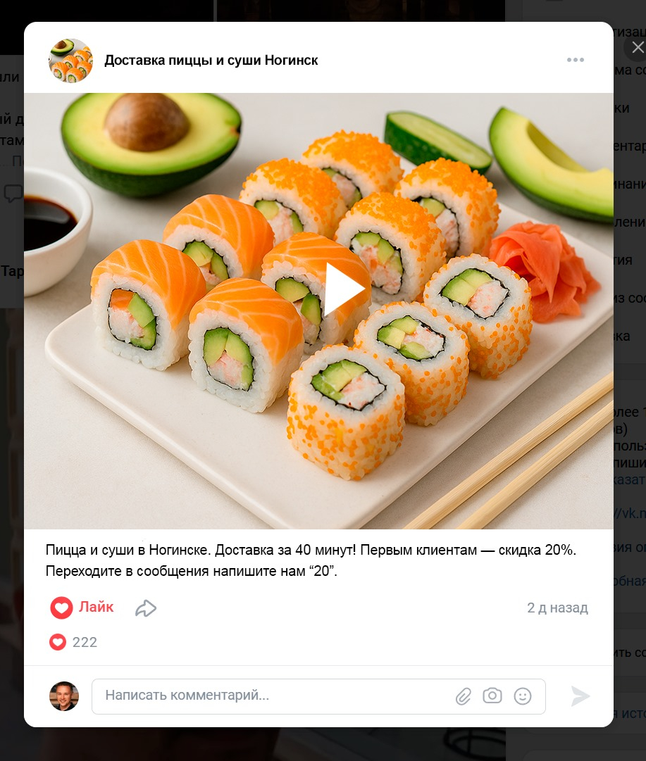 Лучший пост: видео «распаковки» заказа + текст «Пицца и суши в Ногинске. Доставка за 40 минут! Первым клиентам — скидка 20%» → 58 заявок за неделю.