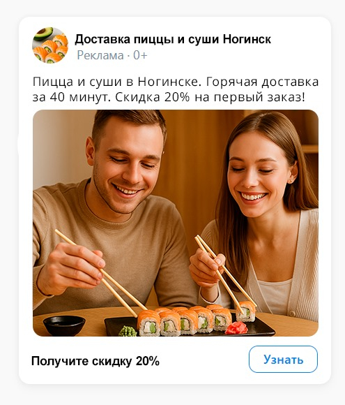 • Креатив: аппетитное фото + текст «Пицца и суши в Ногинске. Горячая доставка за 40 минут. Скидка 20% на первый заказ».