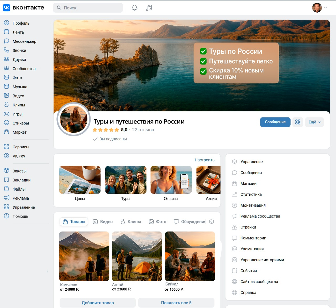 Ко мне обратилось туристическое агентство, специализирующееся на турах по России. Основные направления — Карелия, Алтай, Байкал и Камчатка. Агентство имело хороший продукт и опытных гидов, но клиентов не хватало. Реклама на сторонних площадках была дорогой, а поток обращений нестабильный. Мы решили сосредоточиться на продвижении во ВКонтакте — самой массовой соцсети России, где аудитория активно интересуется путешествиями и планирует поездки. Цель: настроить систему привлечения заявок без больших бюджетов, используя упаковку сообщества, контент и VK Ads.