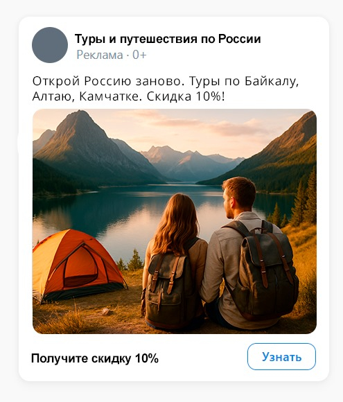 • Креатив: фото или видео с маршрута + короткий оффер: «Открой Россию заново. Туры по Байкалу, Алтаю, Камчатке. Раннее бронирование — скидка 10%.»