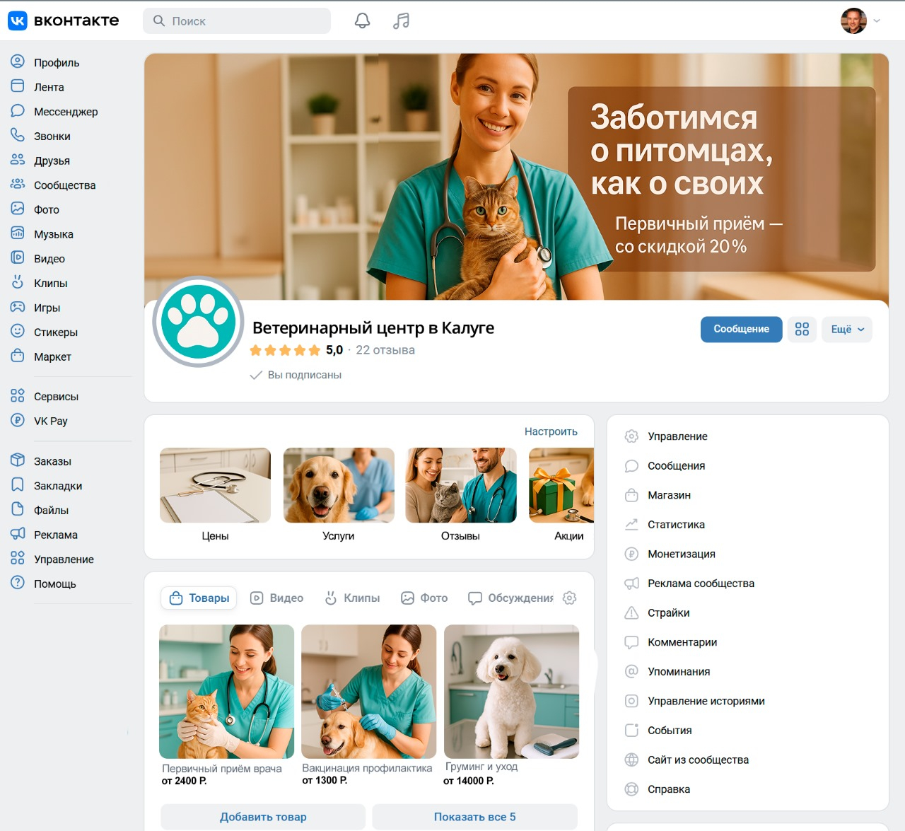 Во ВКонтакте сообщество ветеринарного центра должно вызывать ощущение надёжности, заботы и профессионализма.