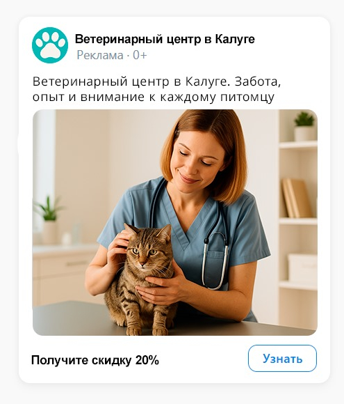 • Креатив: фото врача с животным + текст «Ветеринарный центр в Калуге. Забота, опыт и внимание к каждому питомцу».