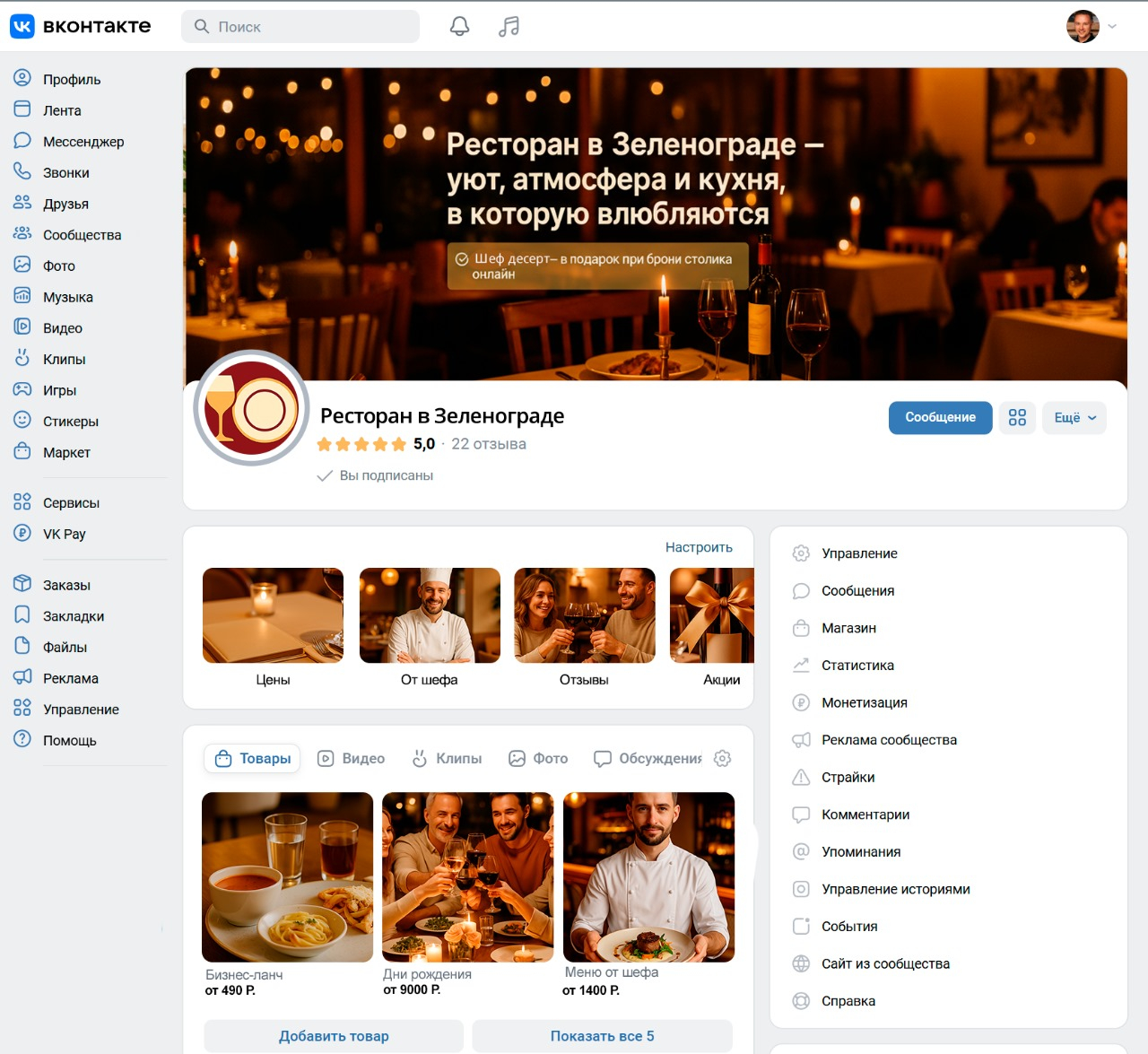 Ко мне обратился владелец ресторана в Зеленограде. У заведения был современный интерьер, отличная кухня и стабильные гости по выходным, но в будние дни зал оставался наполовину пустым. Соцсети вели нерегулярно, а платная реклама не окупалась. Наша цель — привлечь новых гостей через ВКонтакте, показать атмосферу ресторана и удержать внимание аудитории через контент, отзывы и таргетированную рекламу. Всё делалось с ограниченным бюджетом — 30 000 ₽ в месяц.