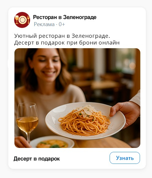 • Креатив: фото зала и блюд + подпись «Уютный ресторан в Зеленограде. Первое вино — в подарок при брони столика онлайн».