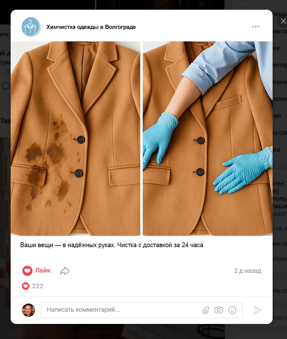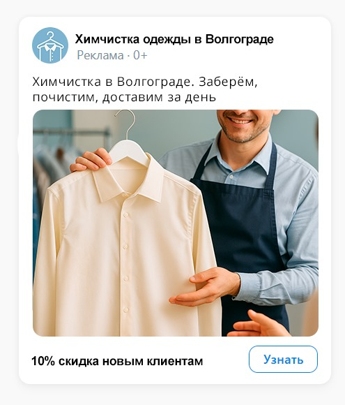 • Креатив: фото вещи до/после + текст «Химчистка в Волгограде. Заберём, почистим, доставим за день».