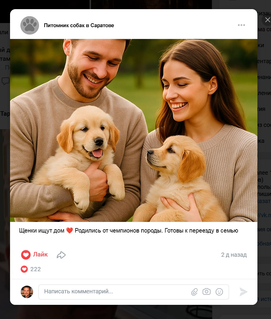 Ко мне обратился владелец питомника собак в Саратове. Заводчик занимался разведением породистых щенков, но сталкивался с типичной проблемой: высокая конкуренция, мало заявок от реальных покупателей, и неэффективная реклама в старых форматах — на досках объявлений и форумах. Мы решили перестроить стратегию: сделать ставку на продвижение ВКонтакте, чтобы привлечь людей, заинтересованных в покупке здоровых щенков от проверенного заводчика. Цель — сформировать доверие к бренду питомника, показать профессиональный подход и получать целевые заявки через VK Ads.
