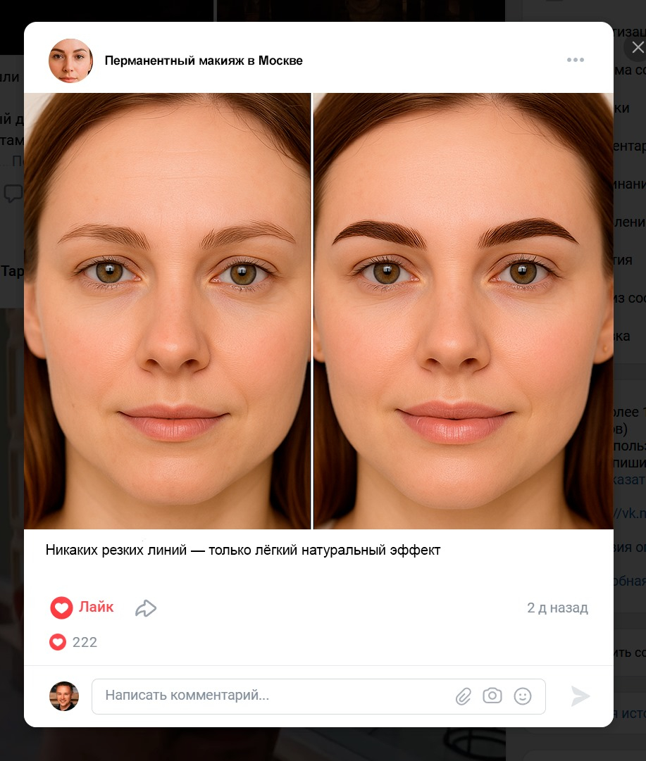 Продвижение перманентного макияжа через ВКонтакте в Москве действительно работает, если: 1. Показать не только результат, но и процесс, атмосферу и стерильность. 2. Упаковать сообщество с акцентом на доверие и личность мастера. 3. Делать контент, который вызывает эмоции, а не только демонстрирует работу. 4. Настроить VK Ads с точным гео и визуалом без агрессии. 5. Отвечать на заявки быстро и с заботой — это часть сервиса.