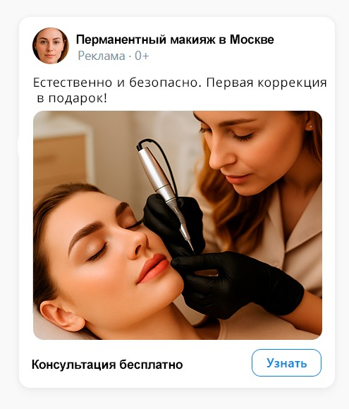 • Креатив: видео с плавным движением кисти и текст «Перманентный макияж в Москве. Естественно и безопасно. Первая коррекция в подарок».