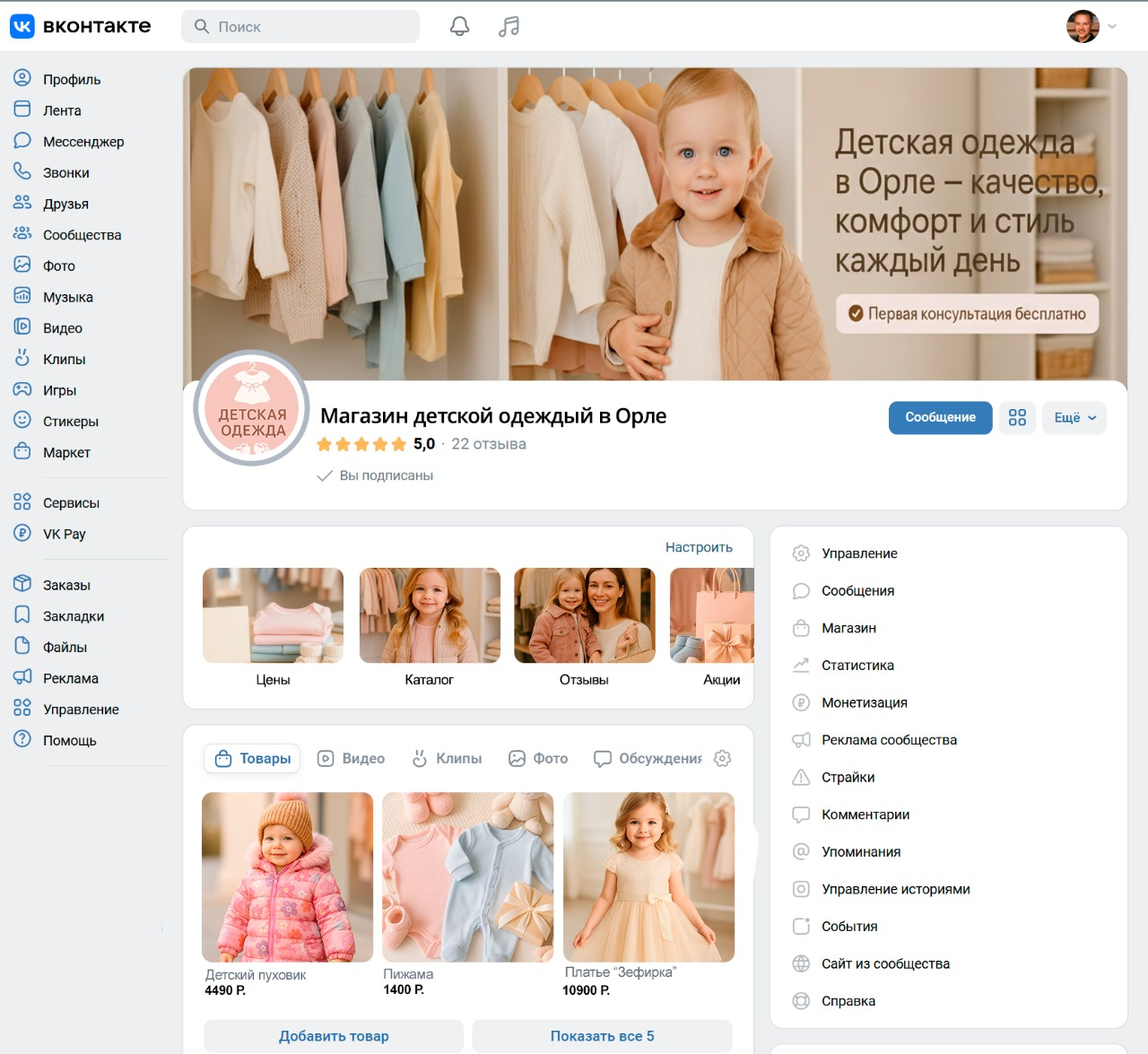 Ко мне обратилась владелица магазина детской одежды в Орле. Магазин был уютный, с качественными брендами, но продаж через соцсети почти не было. Клиенты в основном приходили по старинке — «по знакомству» или по рекомендации. Цель стояла простая: увеличить количество онлайн-заявок и привлечь новых покупателей из города с помощью ВКонтакте. Мы выстроили стратегию продвижения: оформить сообщество, запустить контент, добавить товары и включить таргетированную рекламу через VK Ads.