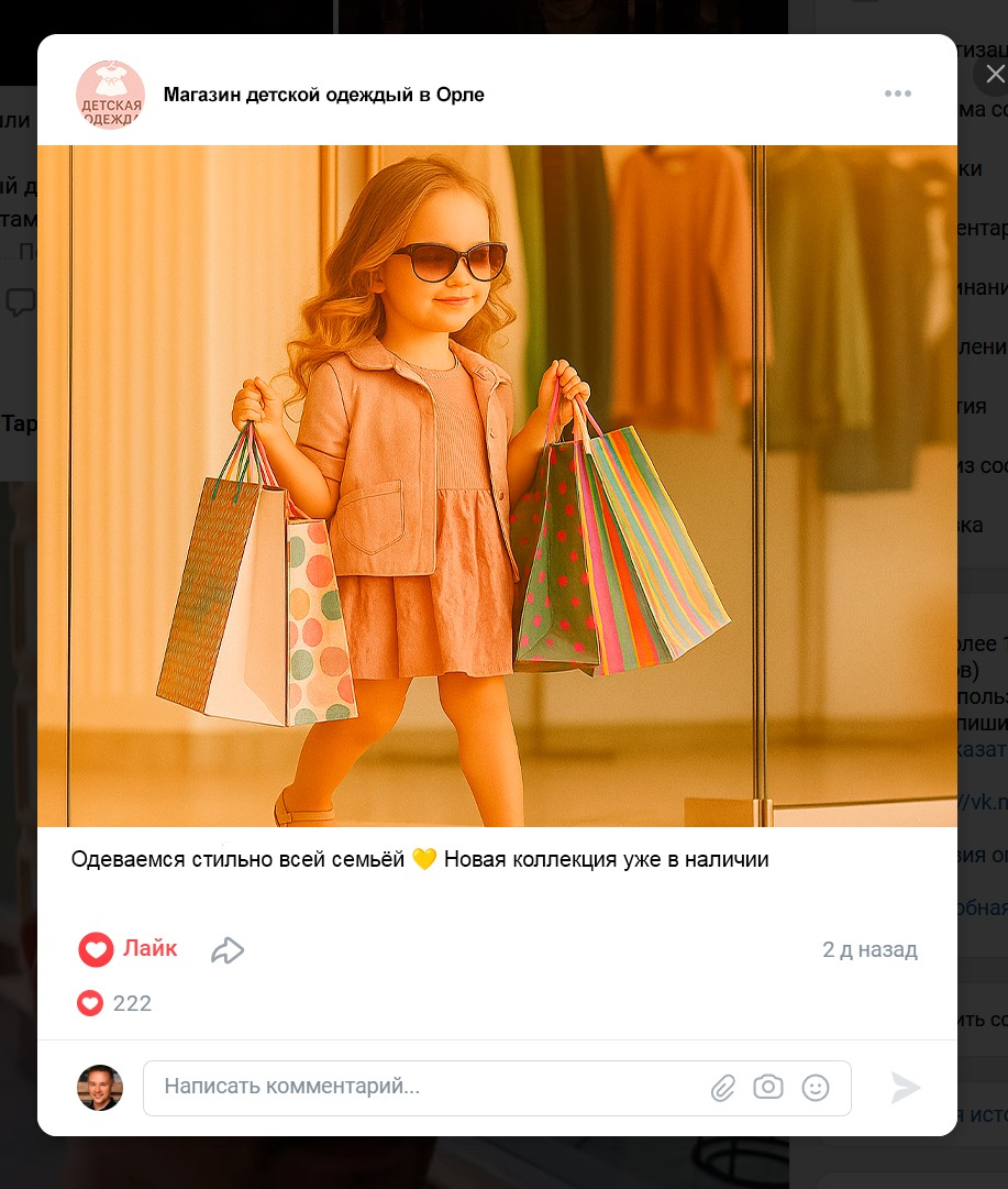 Продвижение магазина детской одежды через ВКонтакте в Орле даёт стабильный поток клиентов, если: 1. Определить свою аудиторию и говорить с ней простым, тёплым языком. 2. Упаковать сообщество под доверие и заботу. 3. Делать живой контент, а не сухой каталог. 4. Настроить VK Ads с гео и визуалом, вызывающим эмоции. 5. Быстро отвечать на заявки и предлагать индивидуальный подход.