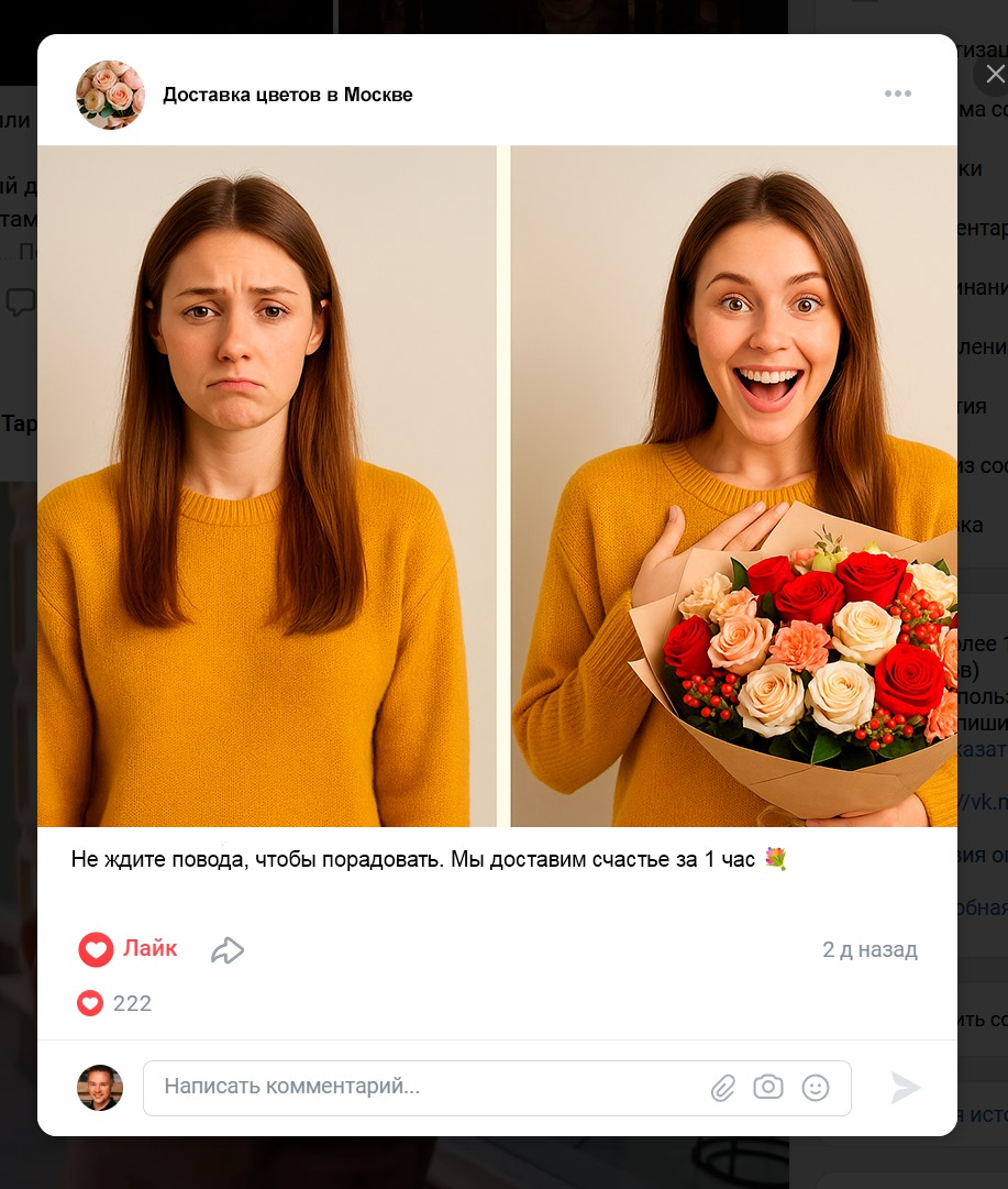 • Ошибка 1: Сначала публиковали только фото букетов без людей. После добавления живых эмоций и лиц — вовлечённость выросла на 80%.
