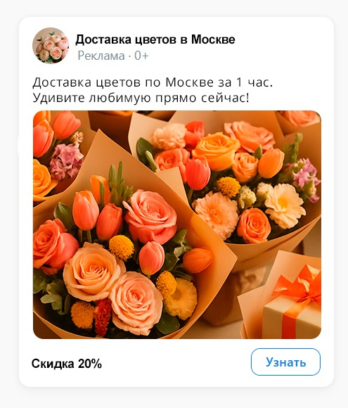 • Креатив: фото красивого букета в руках курьера + текст «Доставка цветов по Москве за 1 час. Удивите любимую прямо сейчас».