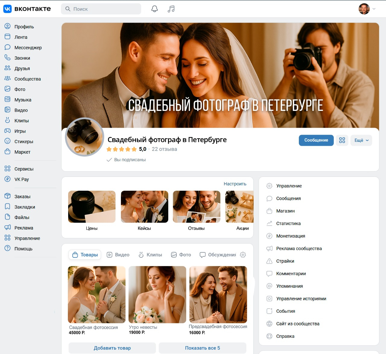 Ко мне обратился свадебный фотограф из Санкт-Петербурга. У него был хороший портфолио, рекомендации и несколько десятков проведённых съёмок, но заказов не хватало. Основной поток клиентов шёл через «сарафанное радио» и случайные заявки в директе. Цель стояла простая — выстроить продвижение во ВКонтакте, оформить сообщество, показать портфолио и создать стабильный поток заявок от пар, которые готовятся к свадьбе.