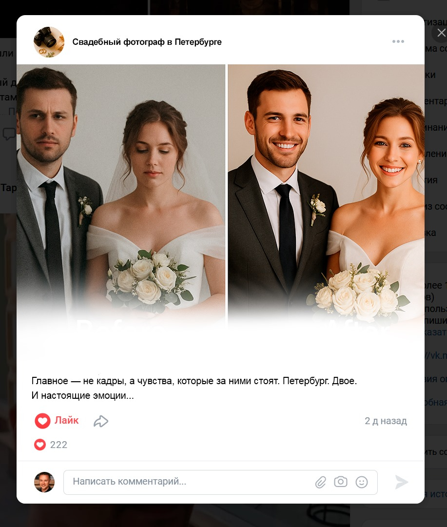 Лучший пост — видео из love story с текстом: «Главное — не кадры, а чувства, которые за ними стоят. Петербург. Двое. И настоящие эмоции». Результат — более 600 репостов и 80 заявок за три недели.