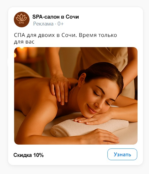 • Креатив: фото уютного кабинета + текст «Спа-салон в Сочи. Отдохните от суеты. Первое посещение — со скидкой 20%».