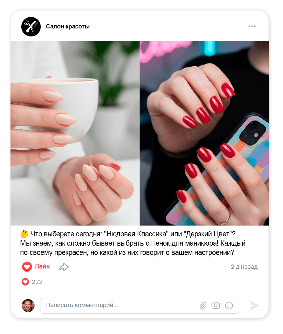 ВК любит посты, которые сохраняют, пересылают и комментируют. У салонов часто «залетают» чек-листы по уходу, ошибки, полезные мини-инструкции и понятные «до/после» с объяснением.
