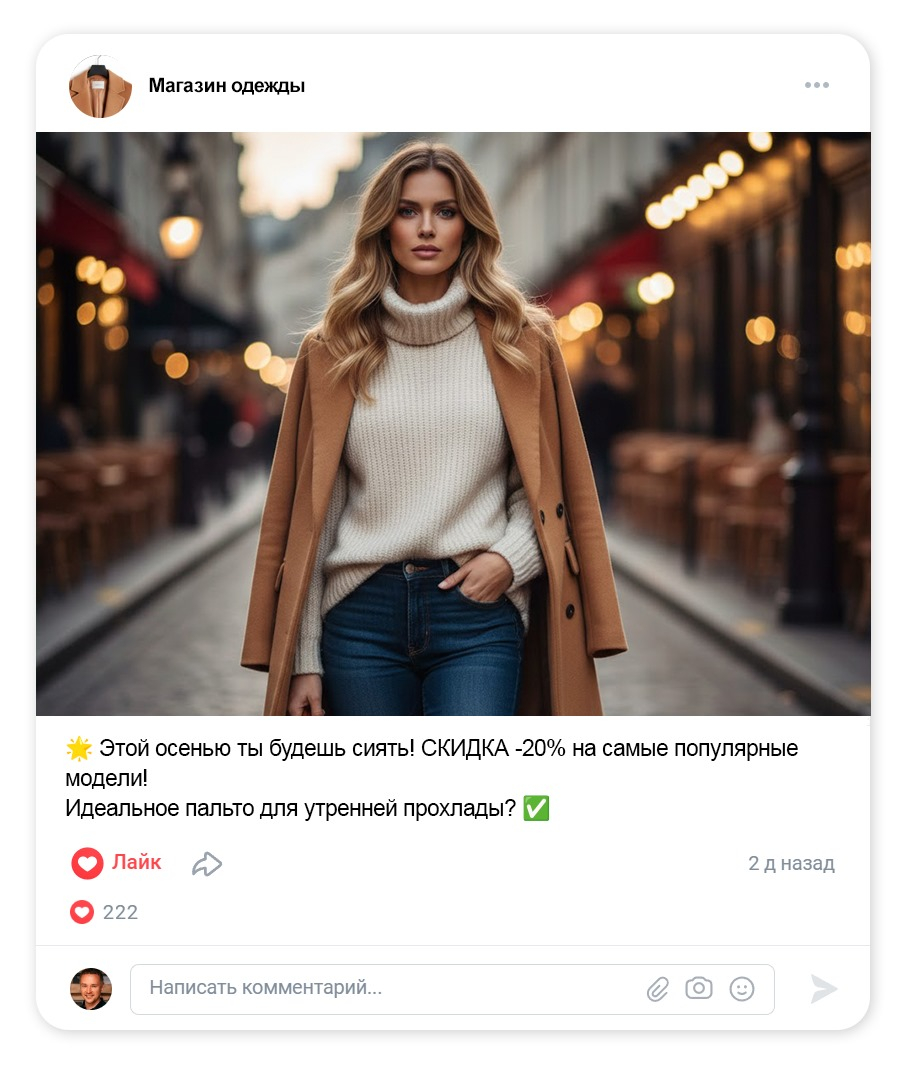 У 8 из 10 магазинов одежды одна и та же история: ВКонтакте вести надо, но времени не хватает. Сегодня вы выложили новинку, завтра забыли, потом «надо бы сделать пост про скидку», и так по кругу. В итоге сообщество выглядит как случайная лента: красивые фото есть, а люди в сообщения пишут редко.