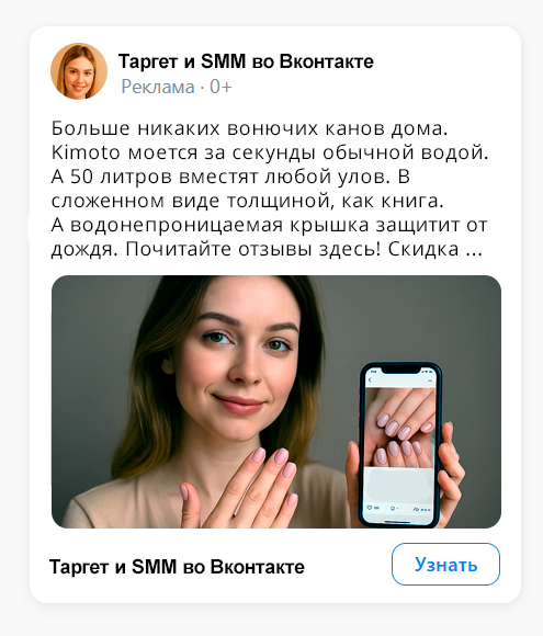 Пример: «Маникюр в (район). Есть окна на этой неделе. Напишите “ОКНО” — подберу время». Ведите рекламу сразу в сообщения.