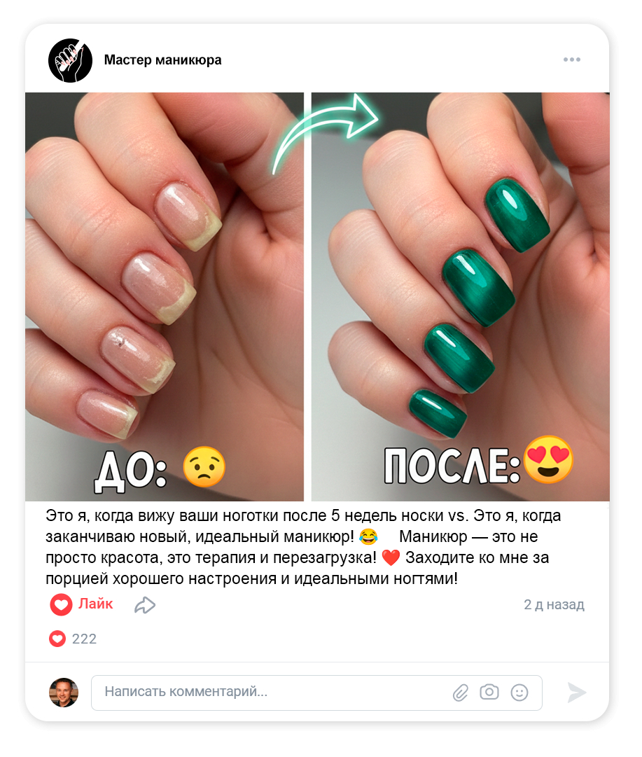 У мастера маникюра часто всё упирается не в качество работы — а в поток людей. Вы делаете аккуратно, стерильно, красиво, клиенты довольны… но записей то много, то пусто. ВК ведёте «как получится»: сегодня выложили фото ногтей, завтра забыли, потом вспомнили и снова запостили. А ещё вечная проблема — непонятно, что писать, и кажется, что все посты одинаковые.