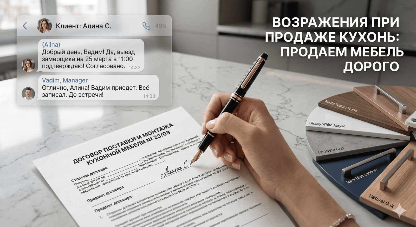 · Как нужно делать: "Конечно, такую важную покупку нужно обсудить с семьей. Скажите честно: вас смущает итоговый бюджет, или есть сомнения по планировке и цвету? Если вопрос в деньгах, мы можем подобрать отличные аналоги фурнитуры без потери качества или оформить рассрочку от салона. А если сомневаетесь в материалах, давайте запишем вас в наш шоурум? Потрогаете текстуры вживую, попьем кофе. Завтра вечером вам будет удобно подъехать?"