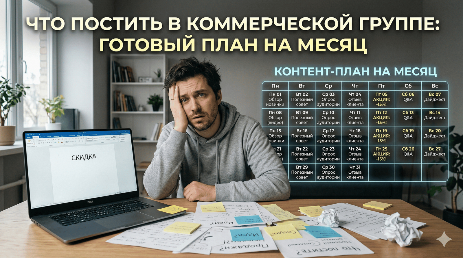 Вчера мне звонил владелец стоматологической клиники. Он сидел перед пустым экраном и совершенно не понимал, что постить в коммерческой группе, кроме избитого слова "скидка". Это классический творческий ступор. Мы набросали простую матрицу рубрик, и теперь свежие публикации выходят регулярно без лишней нервотрепки. Ниже расскажу про рабочий контент-план для малого бизнеса простым языком. Без воды, опираясь на свои 10 лет практики. Вы узнаете: как правильно составить матрицу постов, какие форматы стабильно приносят заявки, почему прямая агрессивная реклама убивает охваты, как быстро оценить качество своего контента.