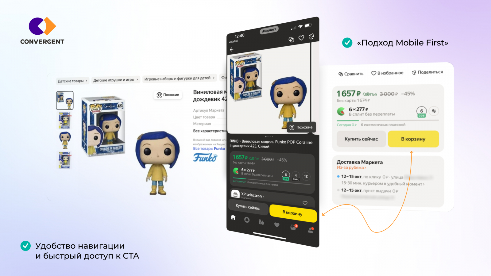 Пример Яндекс Маркет: в десктопе ключевые кнопки «Купить» и «В корзину» закреплены справа, в мобильной версии — зафиксированы внизу экрана для удобства управления одной рукой.