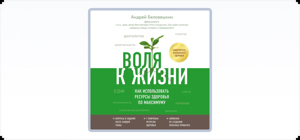 Книга очень простая, каждая глава посвящена какой-то одной теме (например: питание, цифровой детокс, спорт). Есть много крутых глав — «Социальный статус», «Осознанность». Будто взяли твоё колесо баланса и разложили всё по полочкам.