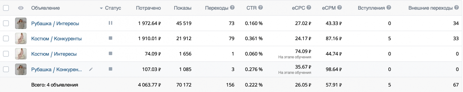 Провели дополнительное тестирование 2 аудиторий - по интересам и на сообщества конкурентов. Получили 67 переходов на карточки товара Wildberries по 26,05 руб. при затратах 4063,77 руб.